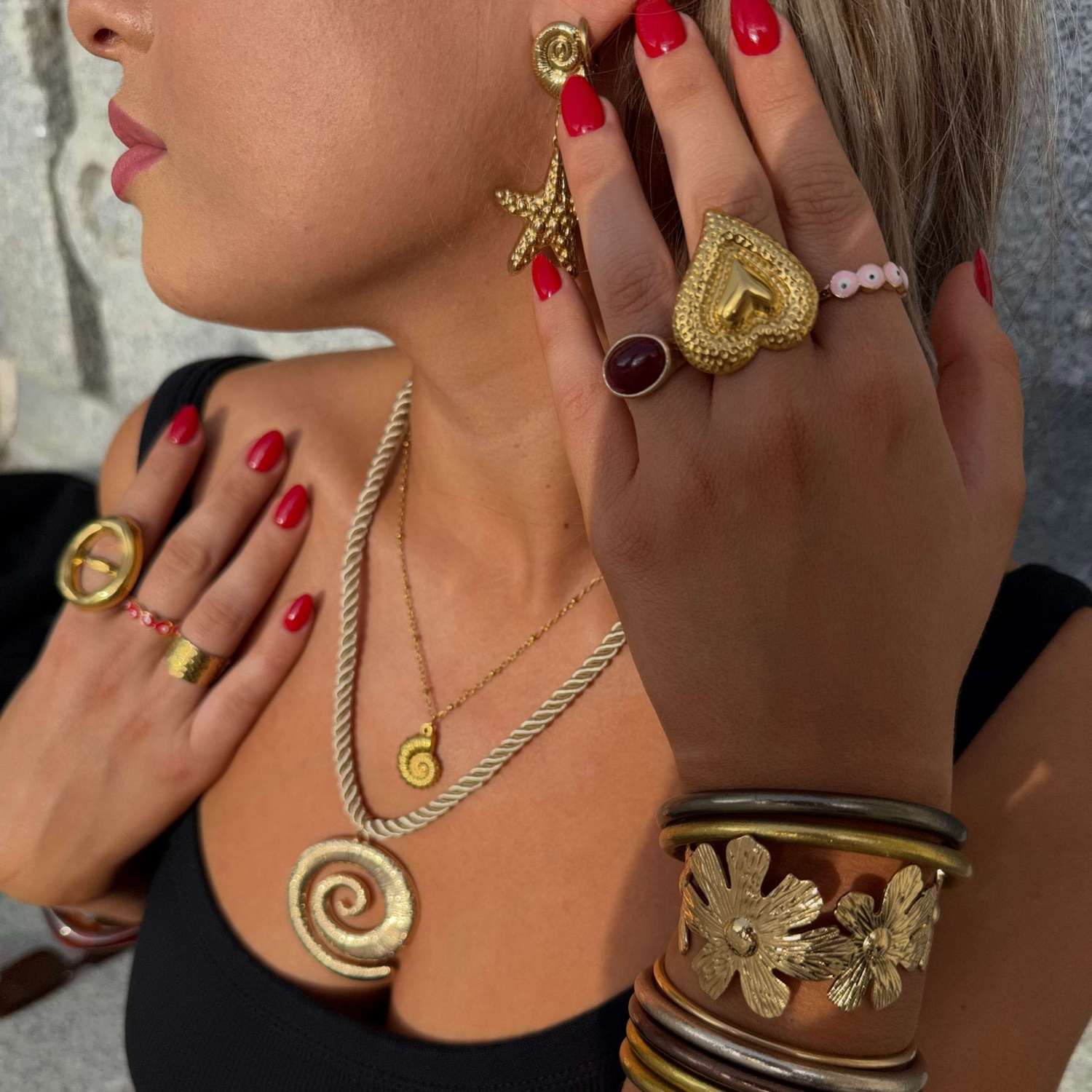 We don't do subtle here. The Amour ring is chunky, heavy, and substantial. The hammered surface gives it a raw, artisanal feel, far from classic designs.