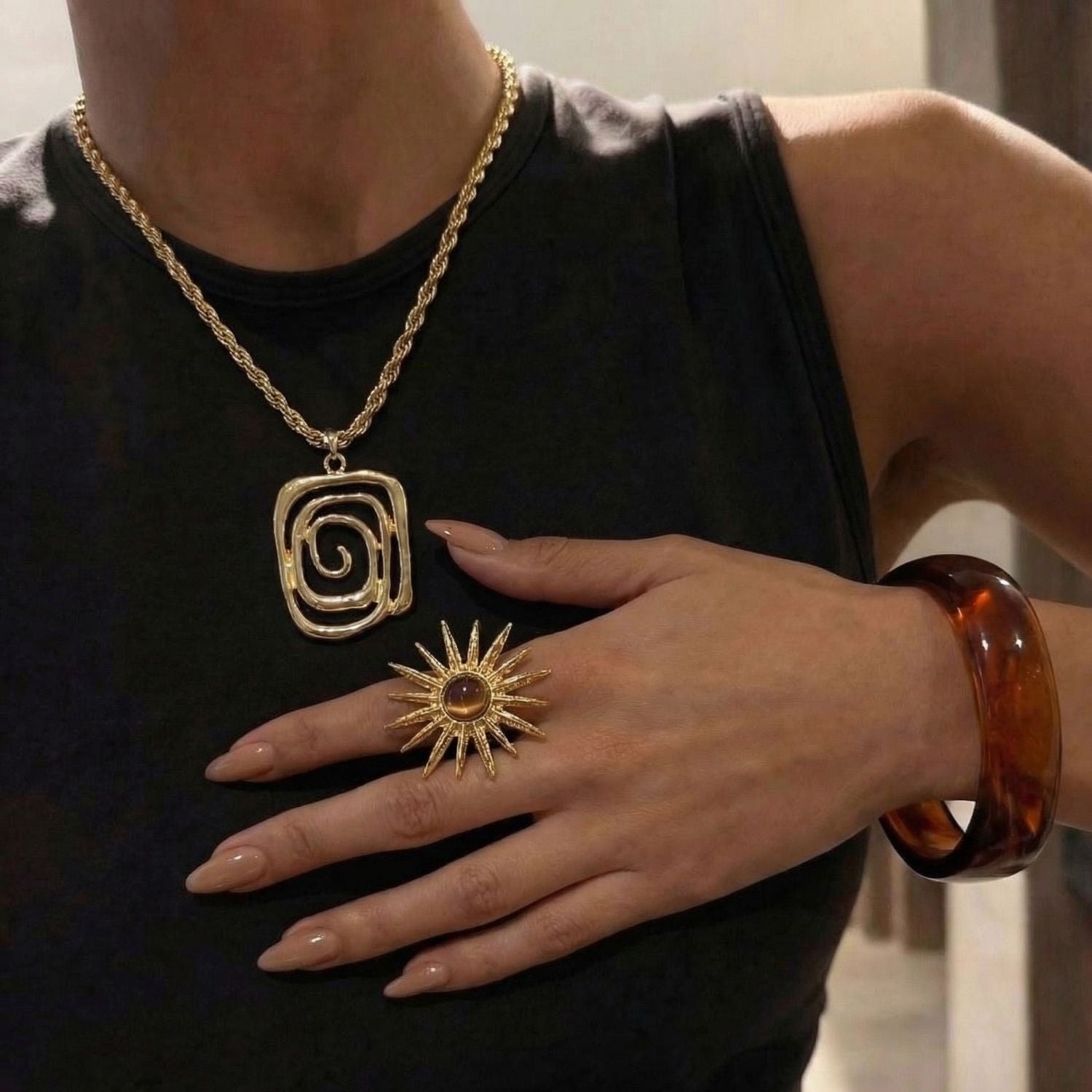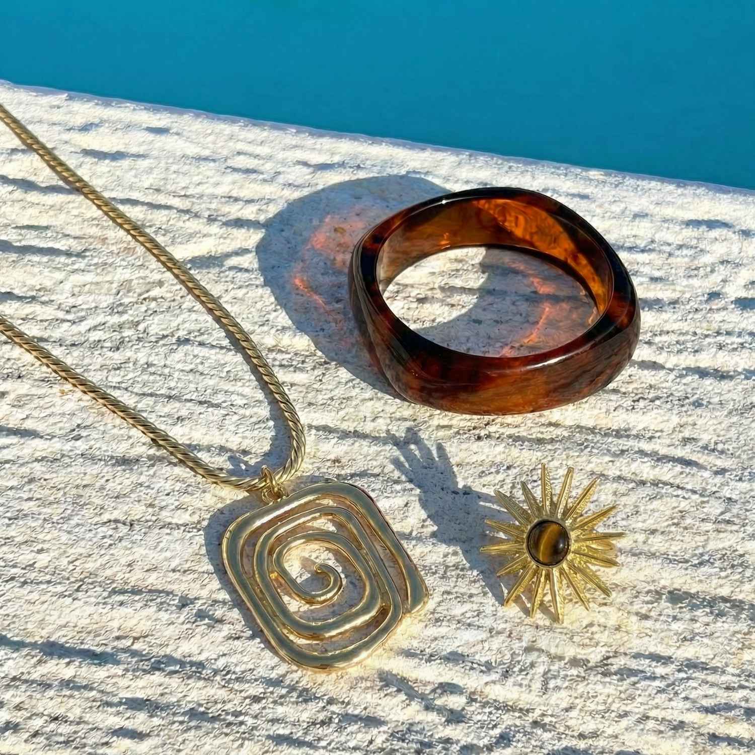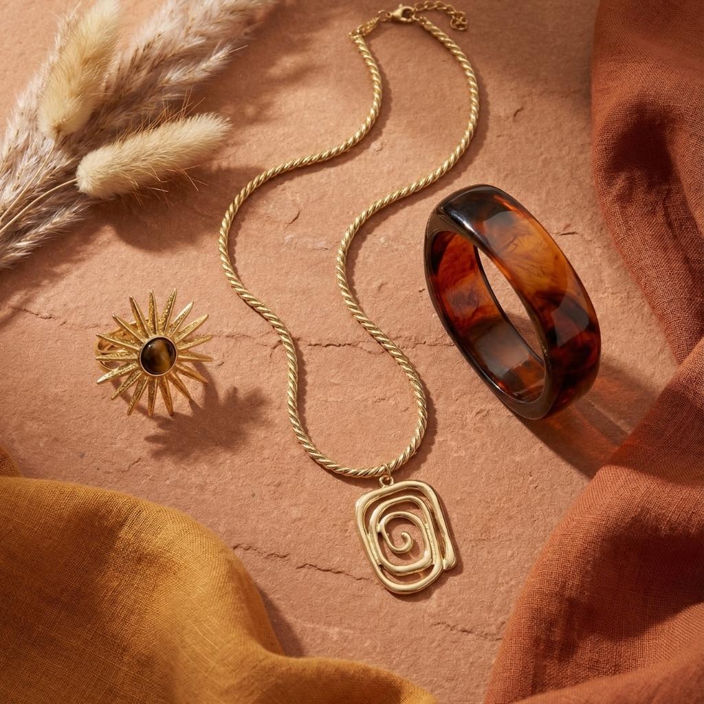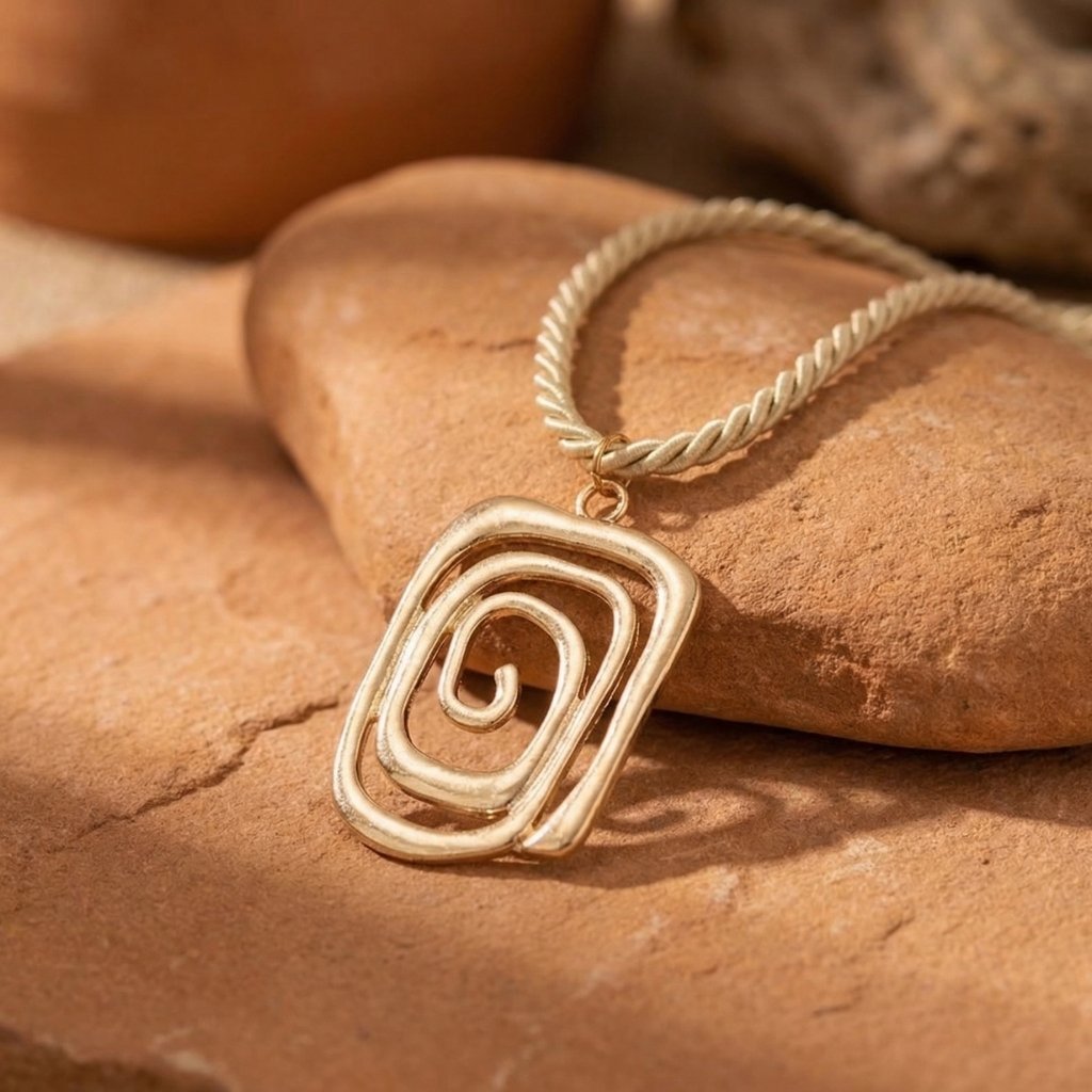 Jade Necklace: A high-shine gold swirl pendant that catches the sun.