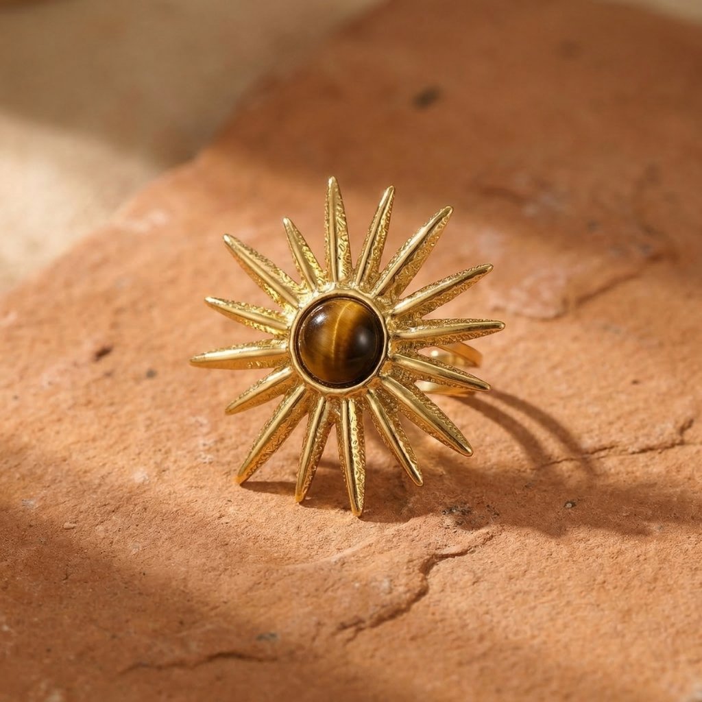 Solaris Ring: A sunburst statement ring inspired by the Mediterranean horizon.