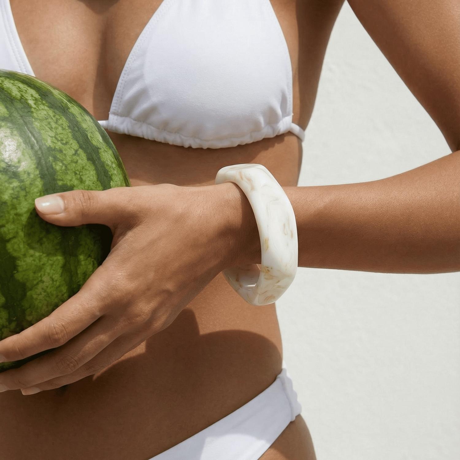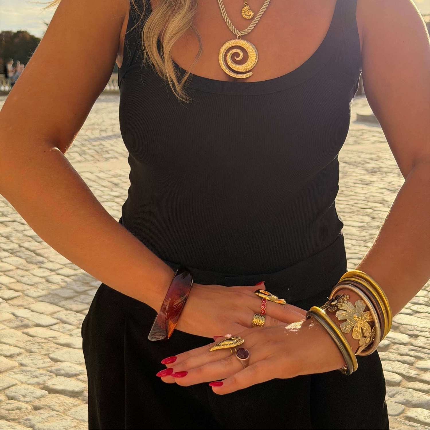 This is an icon in the making. The Sage bracelet is a chunky, sculptural bangle with an exaggerated shape and a rich, marbled brown finish. With a substantial 57g weight, she's solid, confident, and unapologetically bold—a true statement piece that feels as good as it looks.